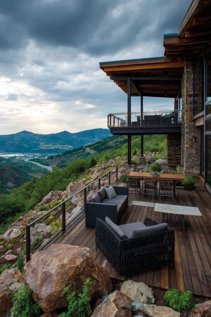 This elevated deck wraps around a mountain lodge style home and uses rich wood decking and stone details. Comfortable seating areas are placed along the edge to enjoy the layered mountain views. The design feels warm, sturdy, and inviting.