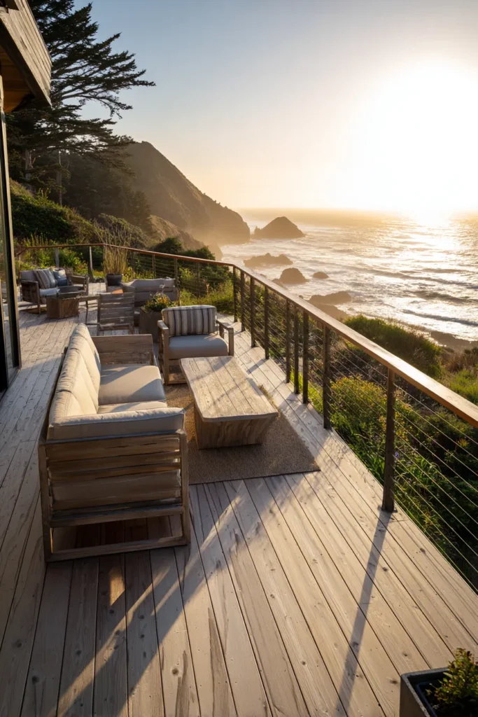 This elevated deck stretches along a coastal edge and features wide plank decking with modern outdoor lounge seating. The railing keeps the view open toward the ocean, allowing sunlight to reflect off the water and brighten the entire space. Soft neutral furniture tones blend beautifully with the natural surroundings and the golden light.