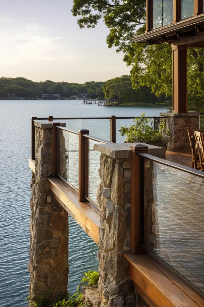 This elevated deck combines natural stone supports with warm wood decking for a balanced and timeless look. Glass railing panels keep the focus on the calm lake below while allowing light to flow freely across the deck surface. The deck feels solid and elegant while still staying visually light.