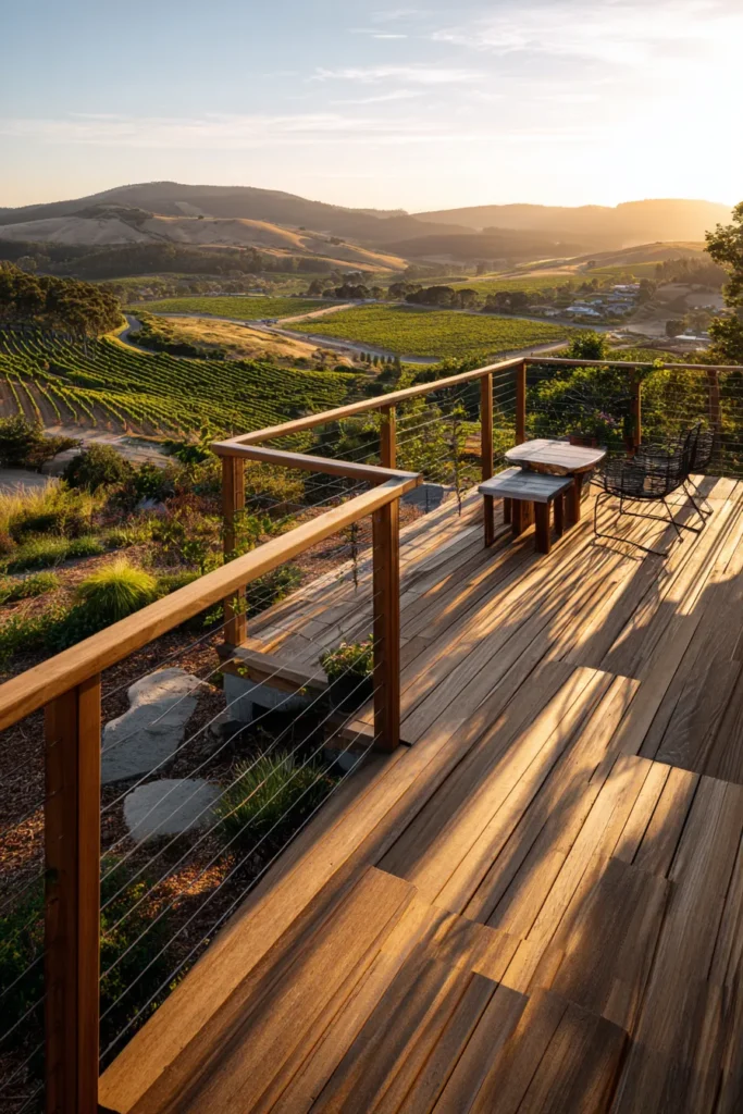 This elevated deck steps down gently along a landscaped hillside, using warm wood planks and natural stone accents. The design follows the land’s shape and opens up to rolling hills and wide open countryside views. Everything feels intentional yet relaxed.