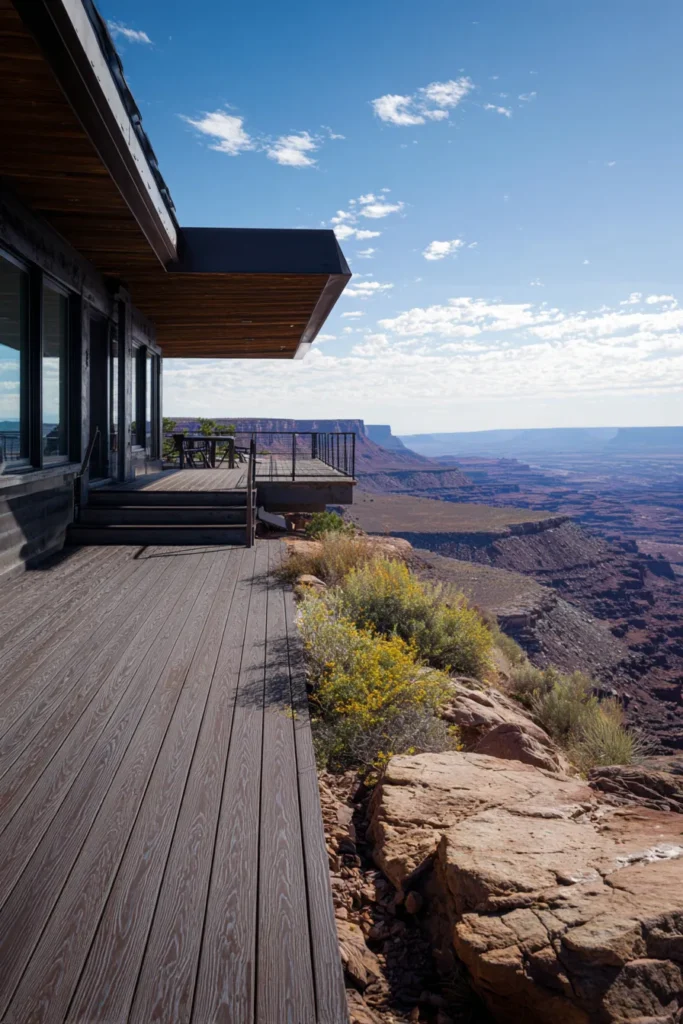 This raised deck sits along a dramatic rocky edge and uses wide wood planks that lead the eye straight toward the canyon beyond. The structure feels sturdy and confident while still keeping the design minimal. The open railing allows the vast landscape to take center stage.