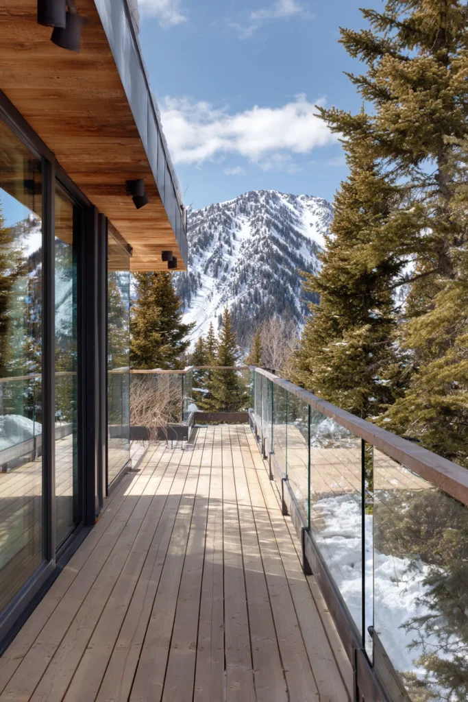 This raised deck runs along a modern home and features pale wood decking paired with a sleek glass railing. The design keeps the view completely open toward snow covered mountains and tall evergreen trees. Floor to ceiling windows mirror the landscape, making the deck feel like a seamless extension of the home.