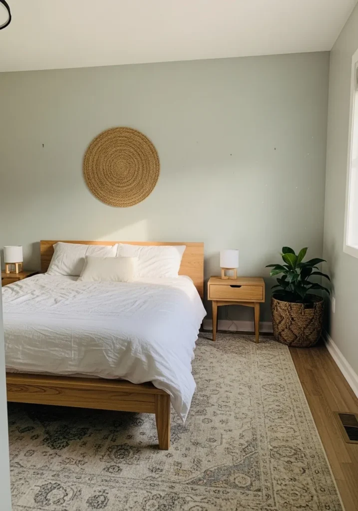 This looks like a soft gray green, and I would place it close to Benjamin Moore October Mist. It sits right between a light sage and a muted gray, which gives it that calm, easy look. Next to the light wood bed and woven wall piece, it feels quiet and a little earthy without being too green.