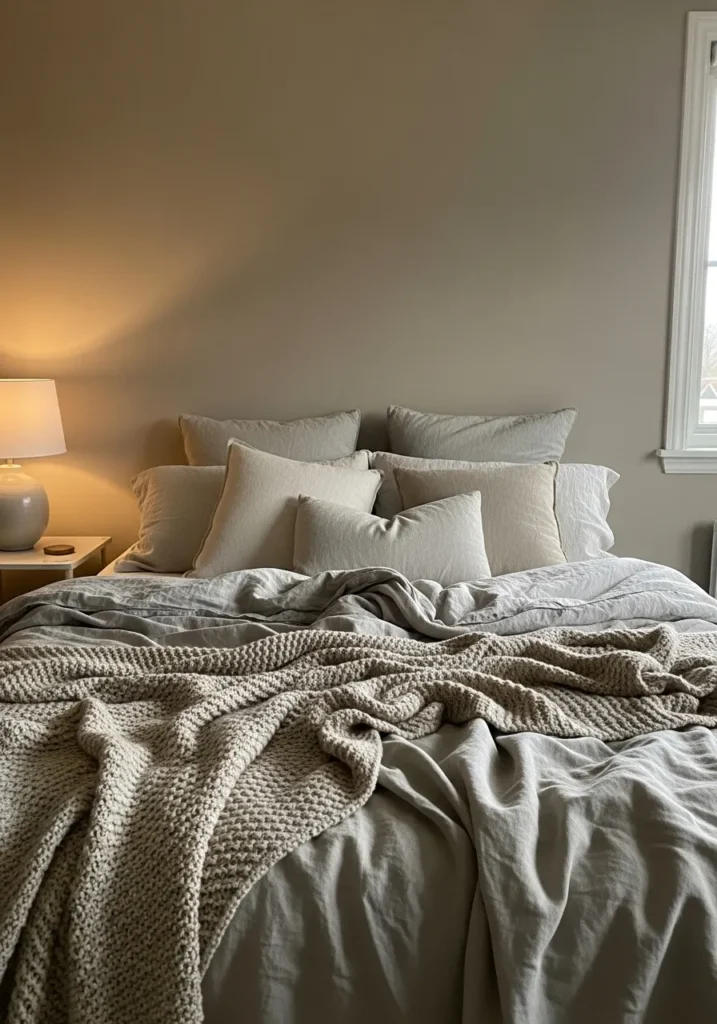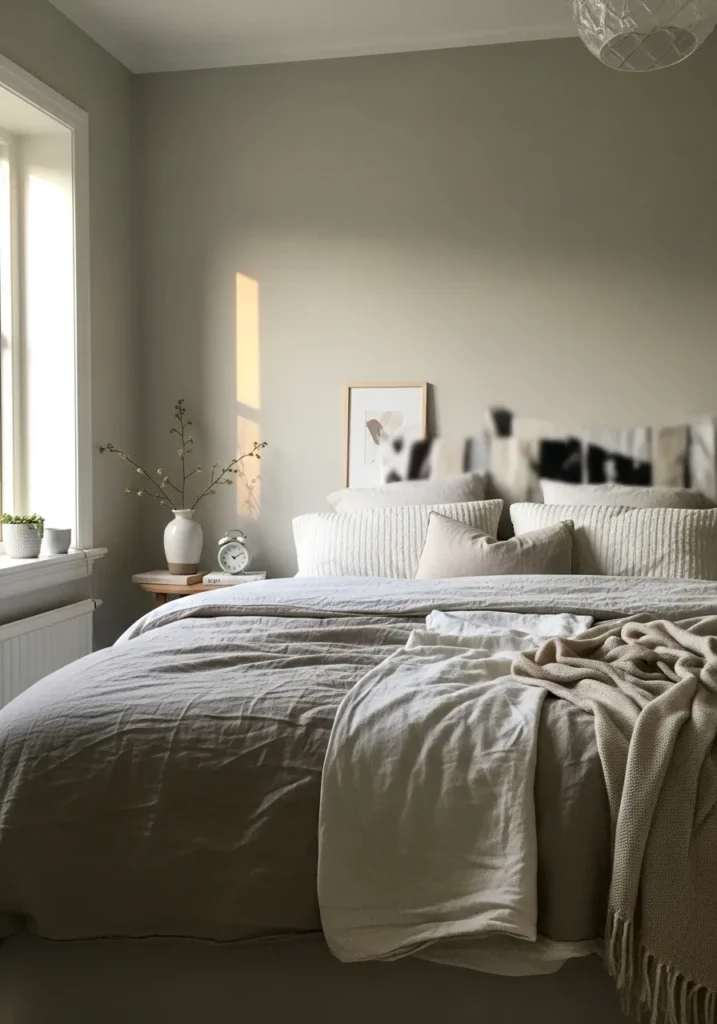 This looks like a warm greige, and I would put it close to Benjamin Moore Edgecomb Gray. It sits right between beige and gray, which makes it easy to live with day to day. It does not feel too cool or too yellow. Just soft and steady, especially next to layered neutral bedding like this.