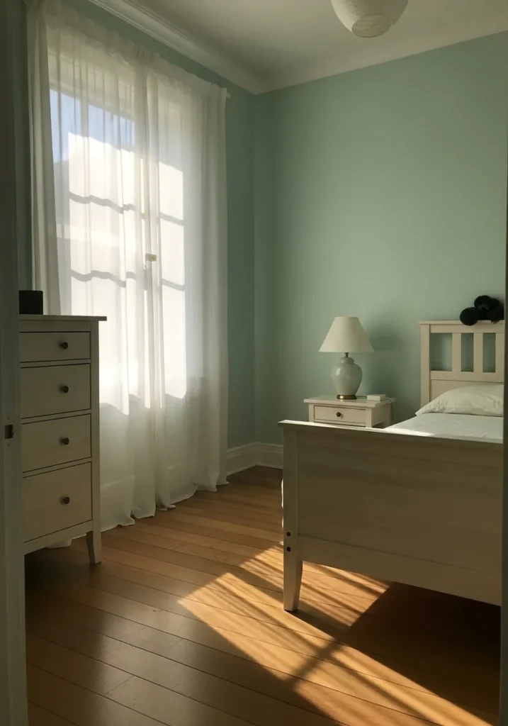 This looks like a soft mint green, and I would place it close to Benjamin Moore Hollingsworth Green. It has that pale, slightly fresh tone that sits between green and a hint of blue, but it stays gentle rather than bright. Next to the white furniture, it feels clean and a little airy without being cold.