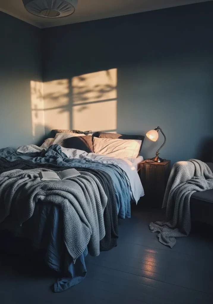 This looks like a deep muted blue, and I would place it close to Benjamin Moore Hale Navy, just softened a touch. It is darker than most bedroom blues but not harsh, since it carries a bit of gray in it. Next to the layered bedding, it feels calm and a little cocooning without being too heavy.