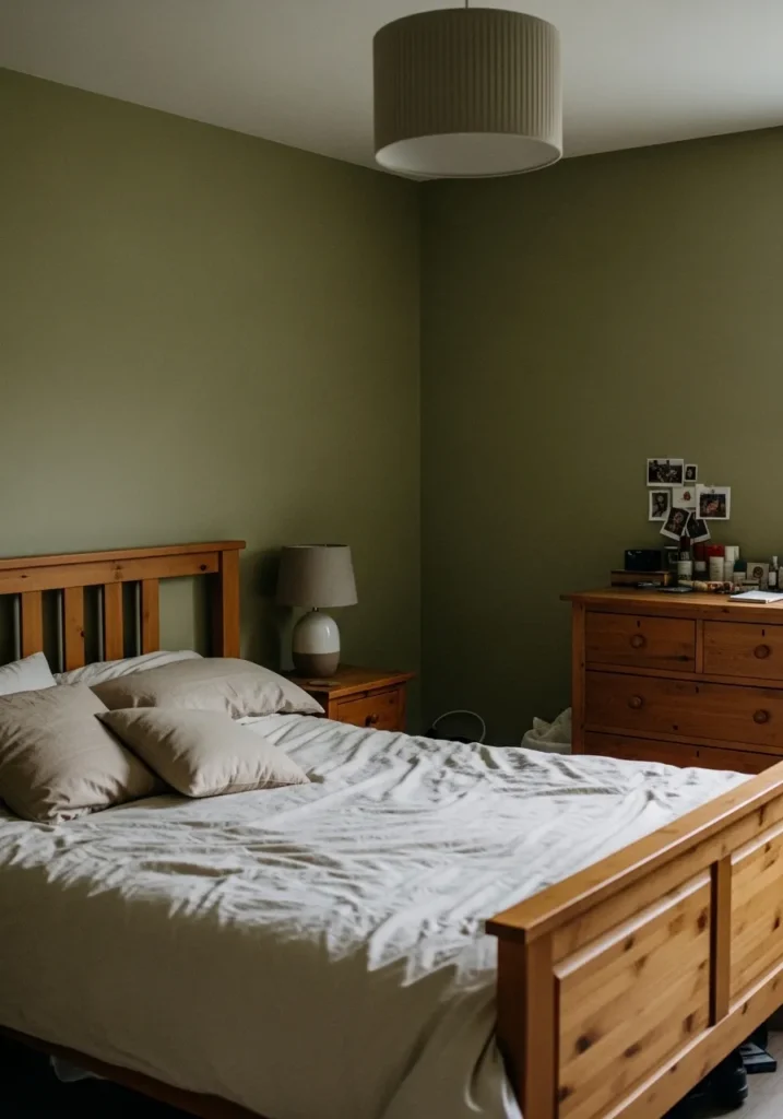 This looks like a muted olive green, and I would place it close to Benjamin Moore Saybrook Sage. It has that slightly earthy tone that sits between green and brown, which keeps it feeling calm rather than fresh or bright. Next to the warm wood bed frame, it reads grounded and a little cozy.
