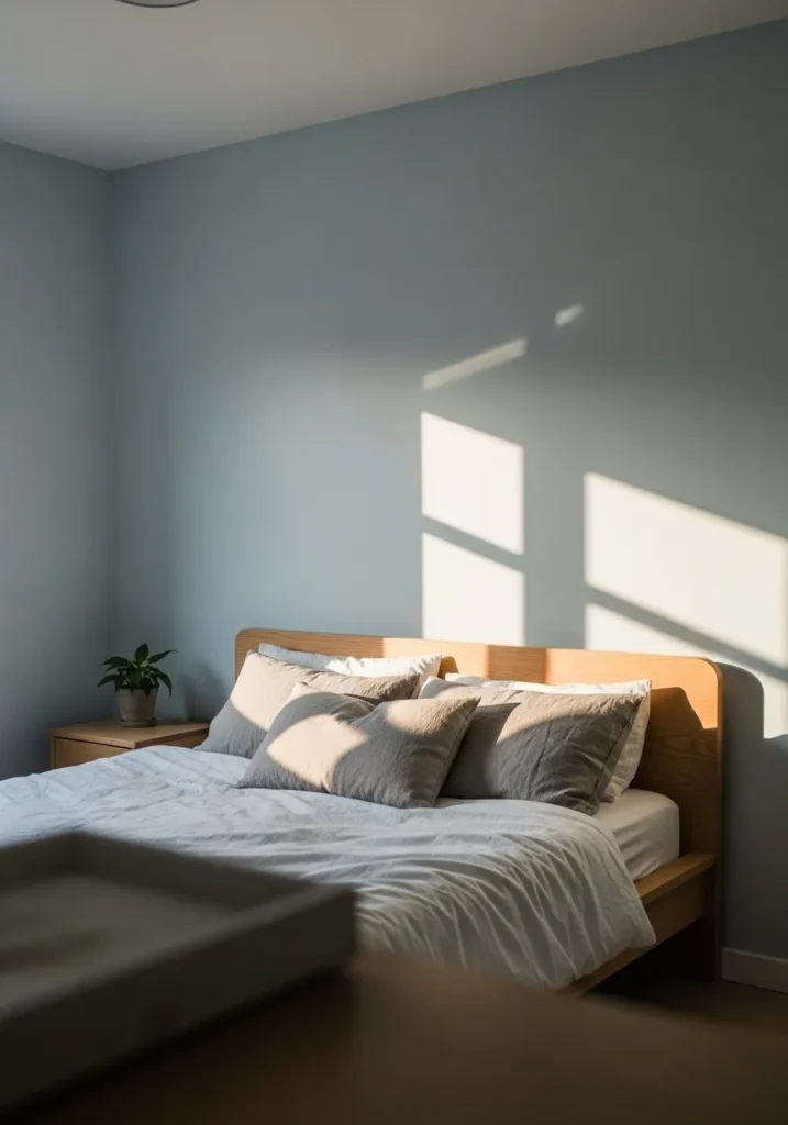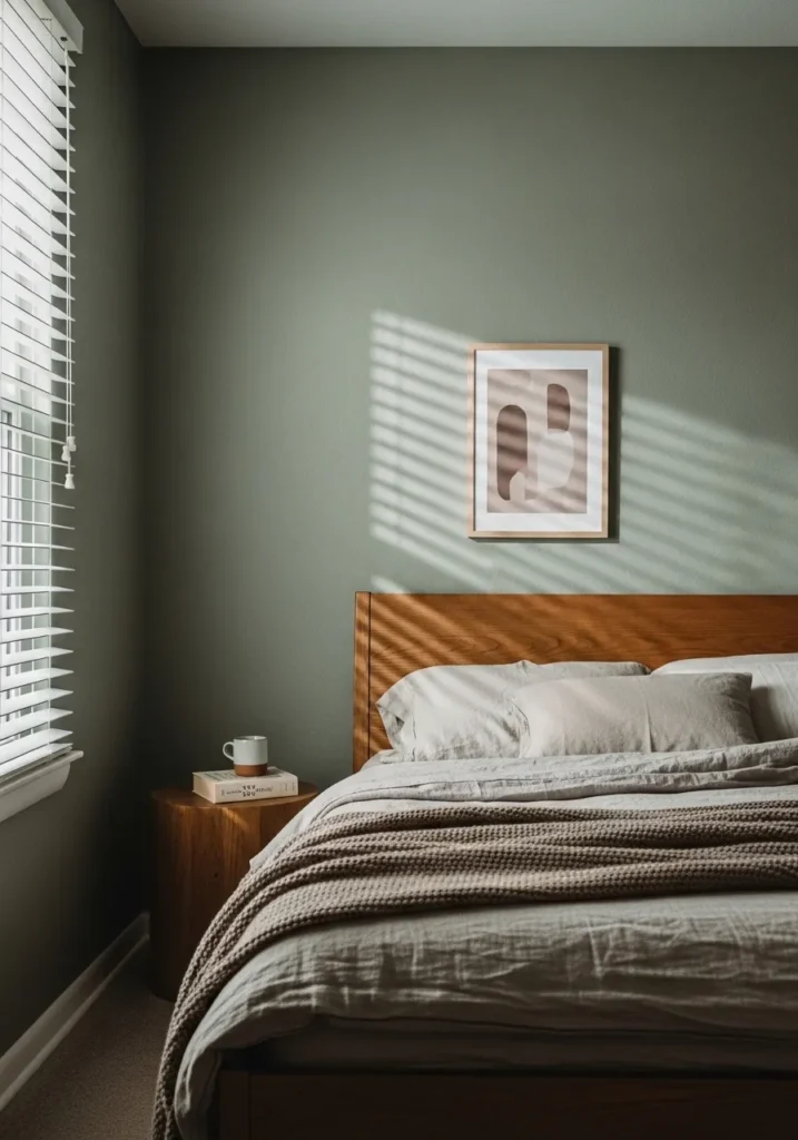 The undertone is gently green-gray, which helps it stay relaxed in different lighting. It works well in smaller bedrooms too, since it does not feel heavy on the walls. I’d keep the rest of the room light and simple, like sheer curtains or pale wood, so the color can stay quiet and easy to look at over time.