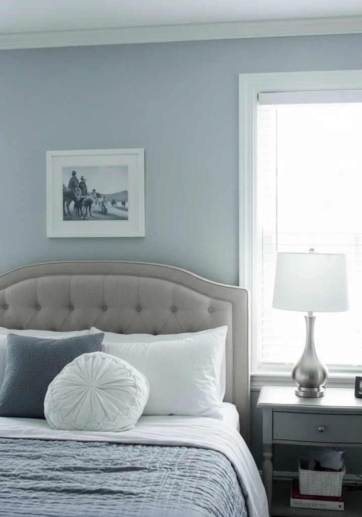 This looks like a soft blue gray, and I would place it close to Benjamin Moore Smoke. It has that quiet mix of blue and gray that feels cool but not cold. Next to the upholstered headboard and white bedding, it comes across as clean and settled without feeling sharp.