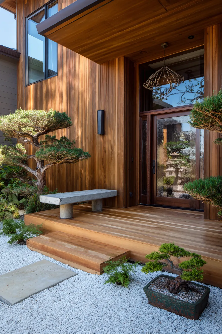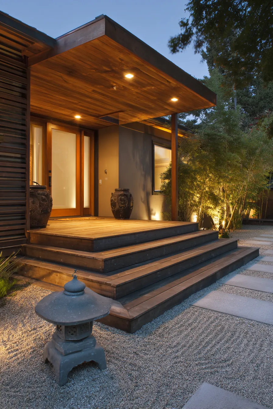 This front porch design feels instantly calming with its smooth stone stepping pads set into a bed of soft gray gravel. Clean white walls balance the warmth of natural wood beams above while subtle greenery frames the walkway without feeling crowded. The wooden front door with simple hardware becomes a quiet focal point rather than a bold statement. Everything feels intentional but never overdone which is very Zen.