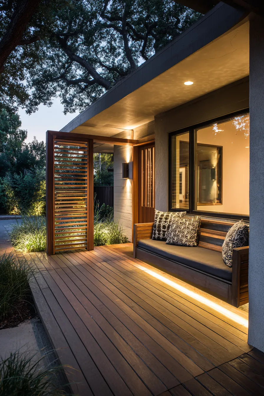 This porch creates a peaceful mood with warm lighting tucked neatly under seating and along architectural lines. Natural wood decking pairs beautifully with neutral cushions and simple patterned pillows. The open yet sheltered layout makes the space feel private without being closed off. It feels balanced and thoughtful from every angle.