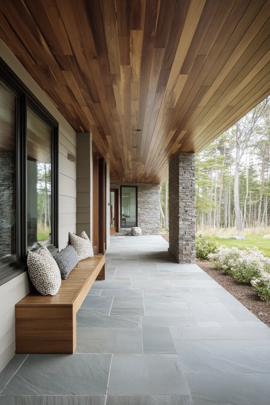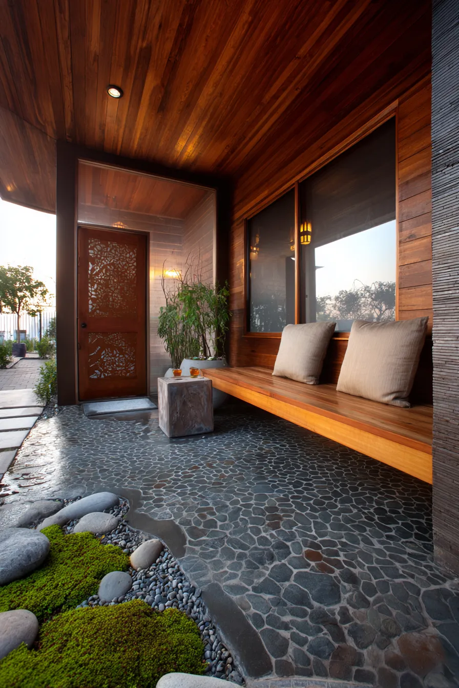This porch features a built in wooden bench paired with smooth stone flooring and a pebble edge detail. Soft cushions and subtle lighting create a cozy but uncluttered seating area. Natural materials take center stage throughout the space. Everything feels balanced and intentional.