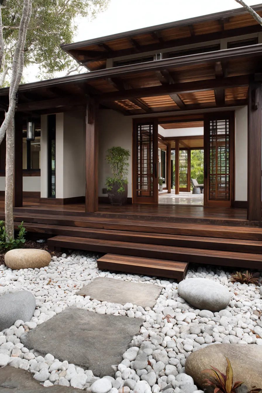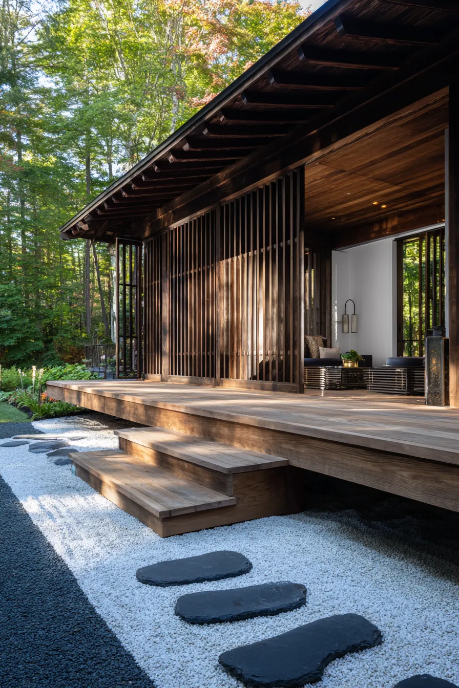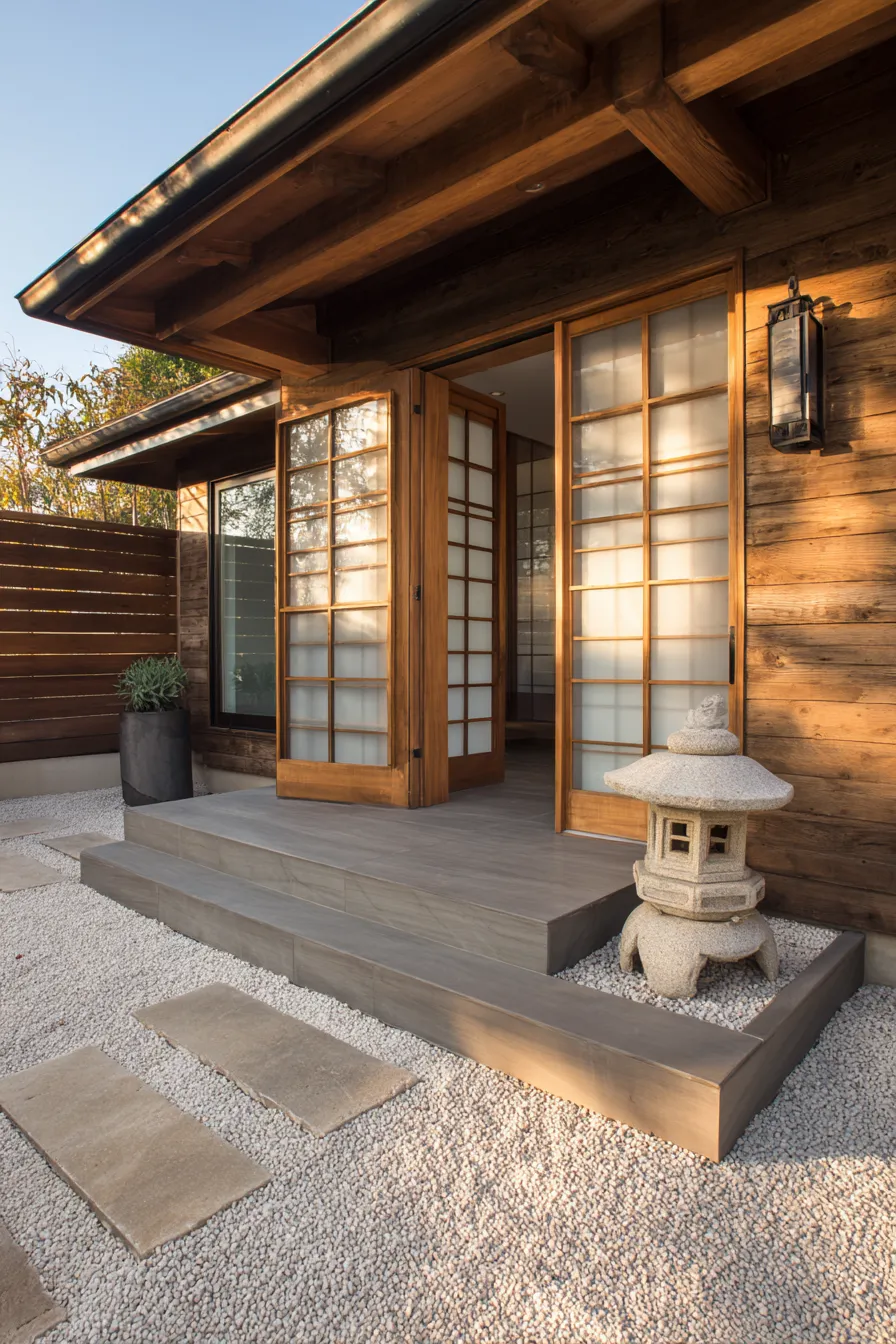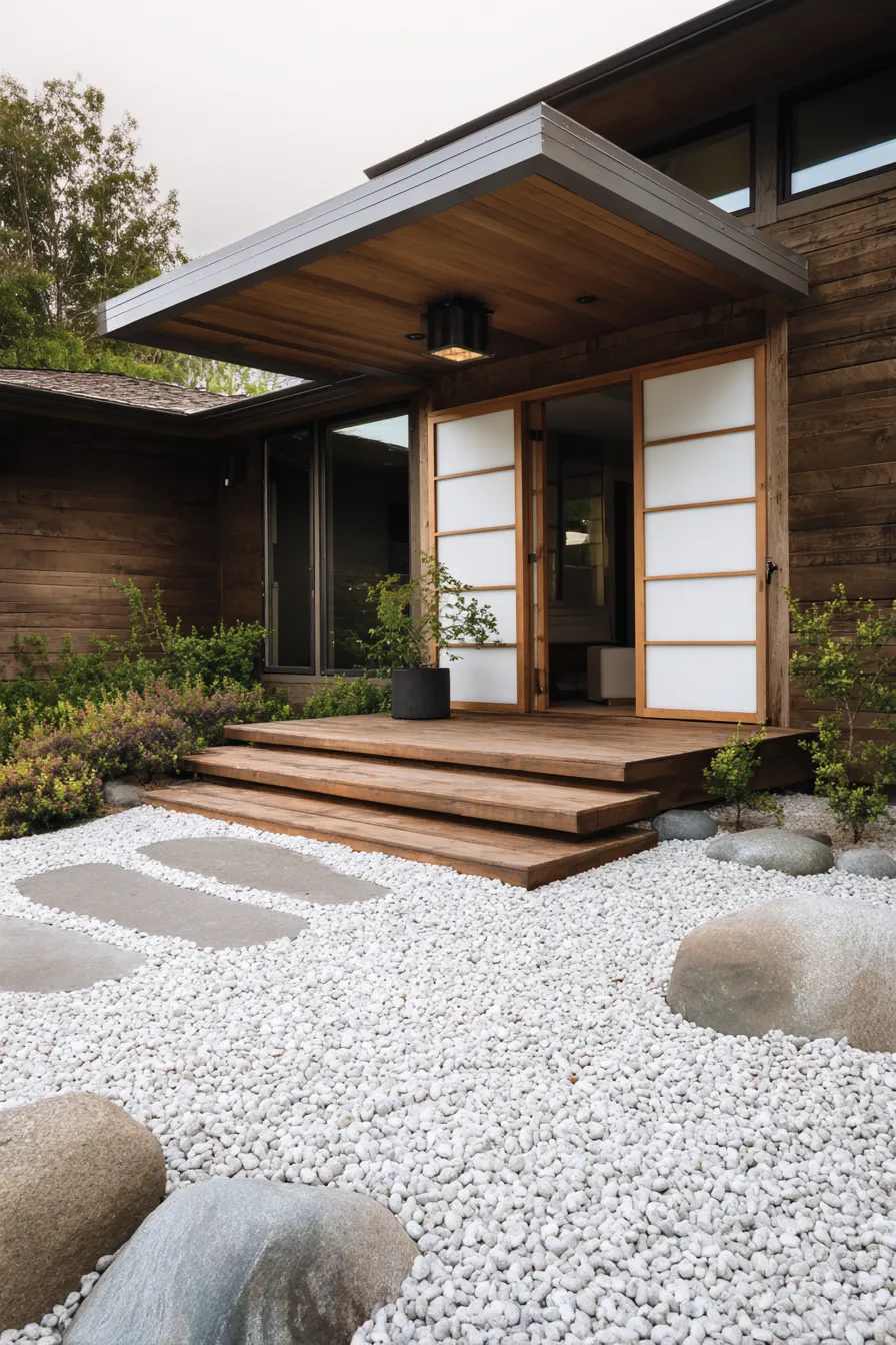 This porch leans into Zen simplicity with sliding panel doors natural wood siding and a bed of white gravel below. Rounded stones and stepping pads soften the space while keeping the layout clean. The wooden steps feel light and understated which fits the overall calming mood. Every detail feels purposeful and uncluttered.