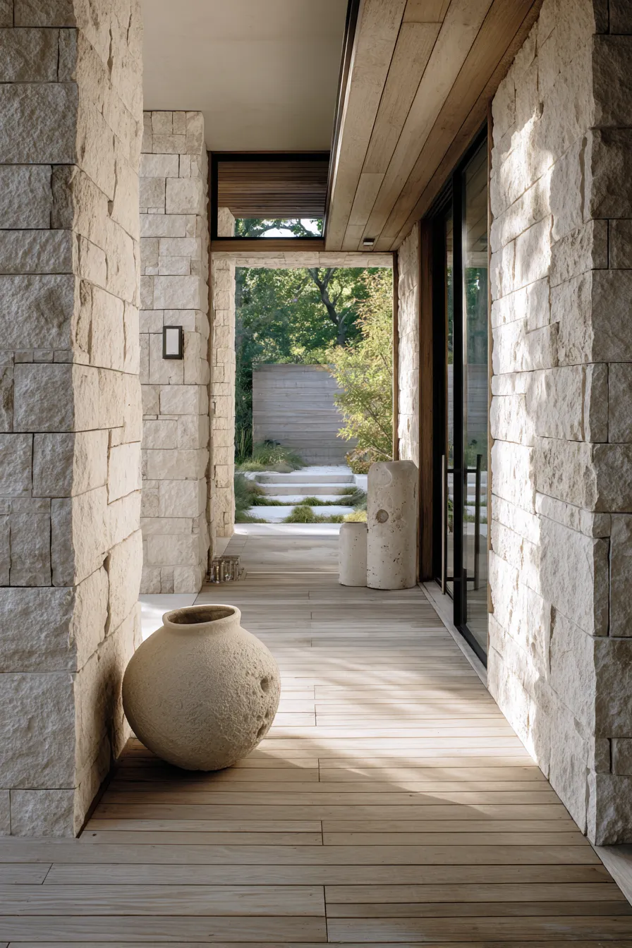 This porch feels like a gentle transition space with light stone walls and warm wood flooring. Large ceramic vessels add texture without cluttering the walkway. Natural light filters in softly creating a relaxed and open feeling. The design stays minimal while still feeling welcoming.