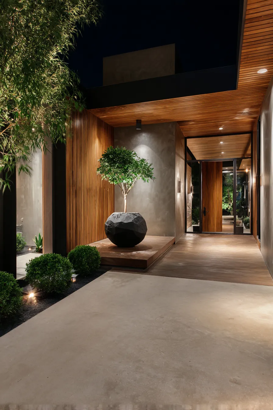 This design combines sleek modern lines with Zen inspired greenery and wood textures. A statement planter anchors the space while soft lighting highlights the architecture. The covered walkway feels private yet open which is perfect for quiet evenings. The balance between modern and natural feels just right.