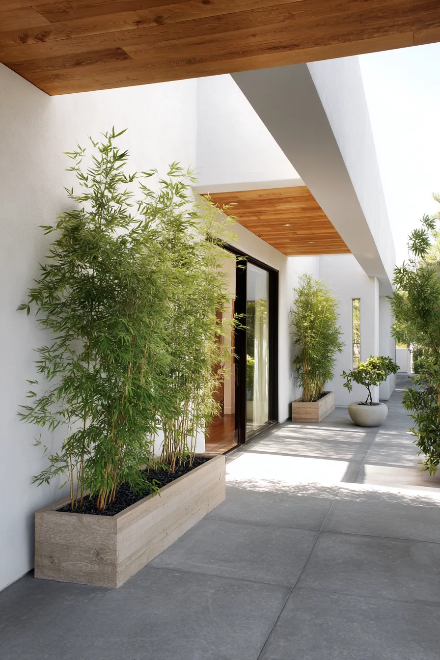This porch uses tall bamboo planters to create a soft natural screen along the walkway. Clean white walls and light stone flooring keep everything fresh and airy. Wood ceiling accents warm up the space without overpowering it. The layout feels open peaceful and refreshingly simple.