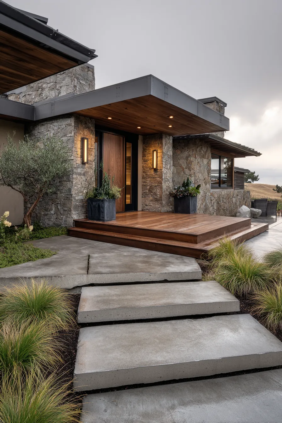 This front porch blends rugged stone walls with warm timber ceilings for a grounded and peaceful look. Wide concrete steps lead up to a smooth wooden platform that feels solid and welcoming. Soft outdoor lighting highlights the natural textures without making anything feel harsh. The mix of stone wood and greenery keeps the design calm yet visually rich.