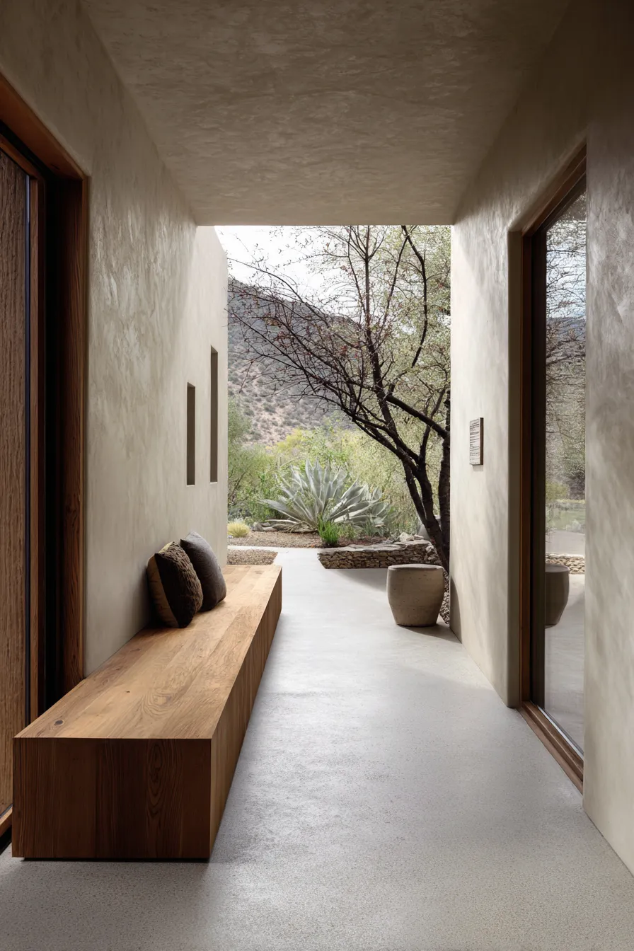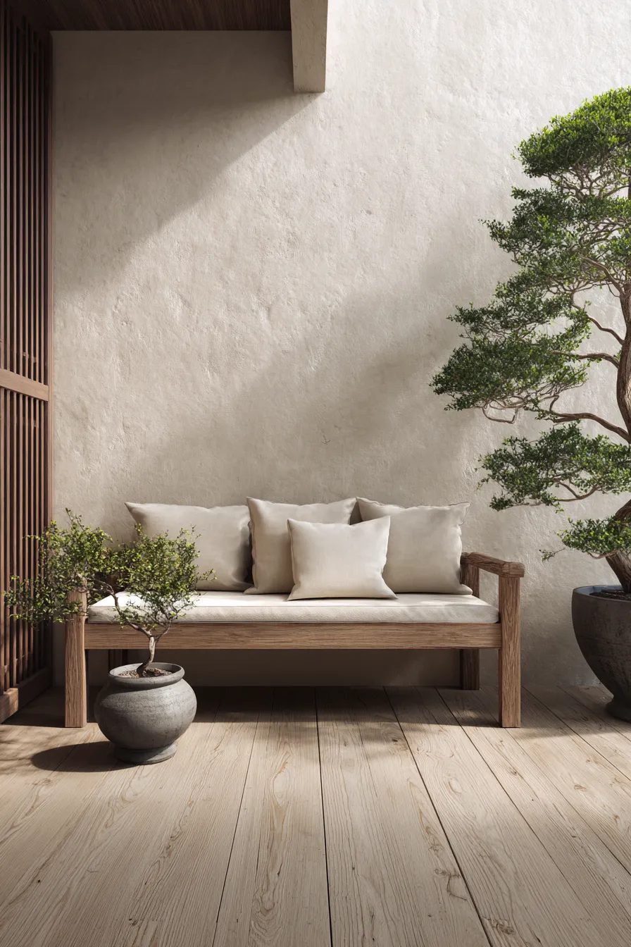 This front porch features a simple wooden bench layered with neutral cushions and surrounded by clean plaster walls. A small potted tree and low greenery add just enough life without cluttering the space. The light wood flooring and soft shadows keep everything feeling open and balanced. The whole setup feels intentional and quiet.