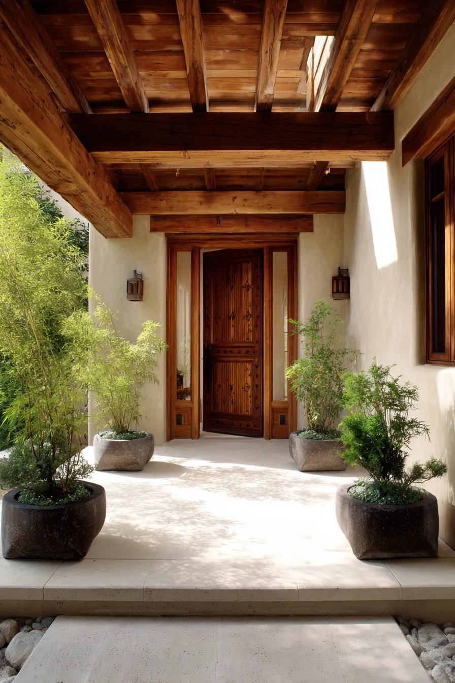 This porch feels like a soft enclosed retreat with warm wood beams overhead and smooth neutral flooring below. Potted greenery frames the entry in a balanced and intentional way. The wooden door becomes a beautiful focal point without overpowering the space. Everything feels shaded peaceful and naturally inviting.