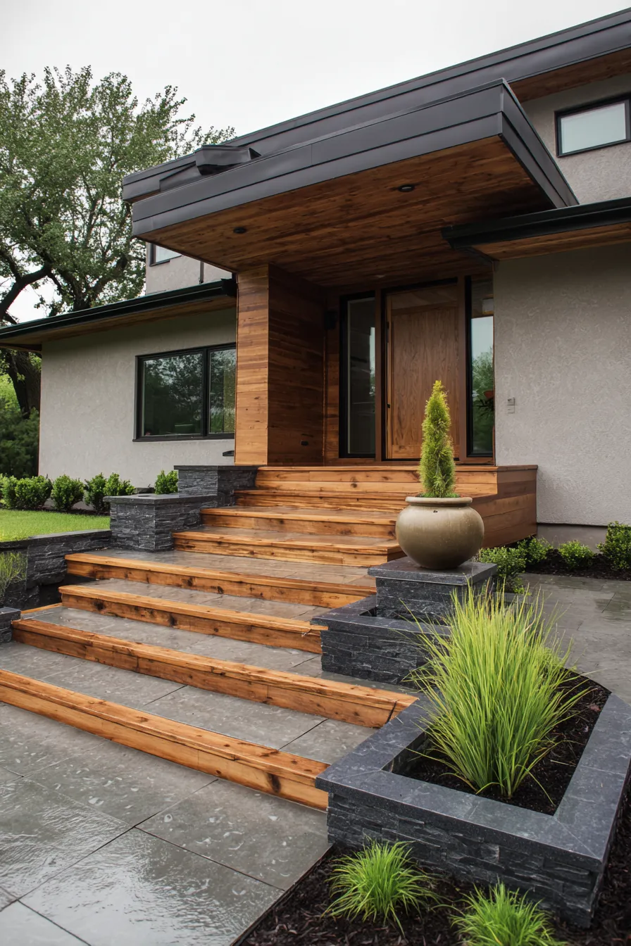 This front porch combines warm wooden steps with dark stone planters for a grounded and balanced look. The layered design creates a gentle visual rhythm that leads you toward the front door. Subtle greenery softens the clean lines without adding clutter. The covered entry keeps everything feeling cozy and protected.