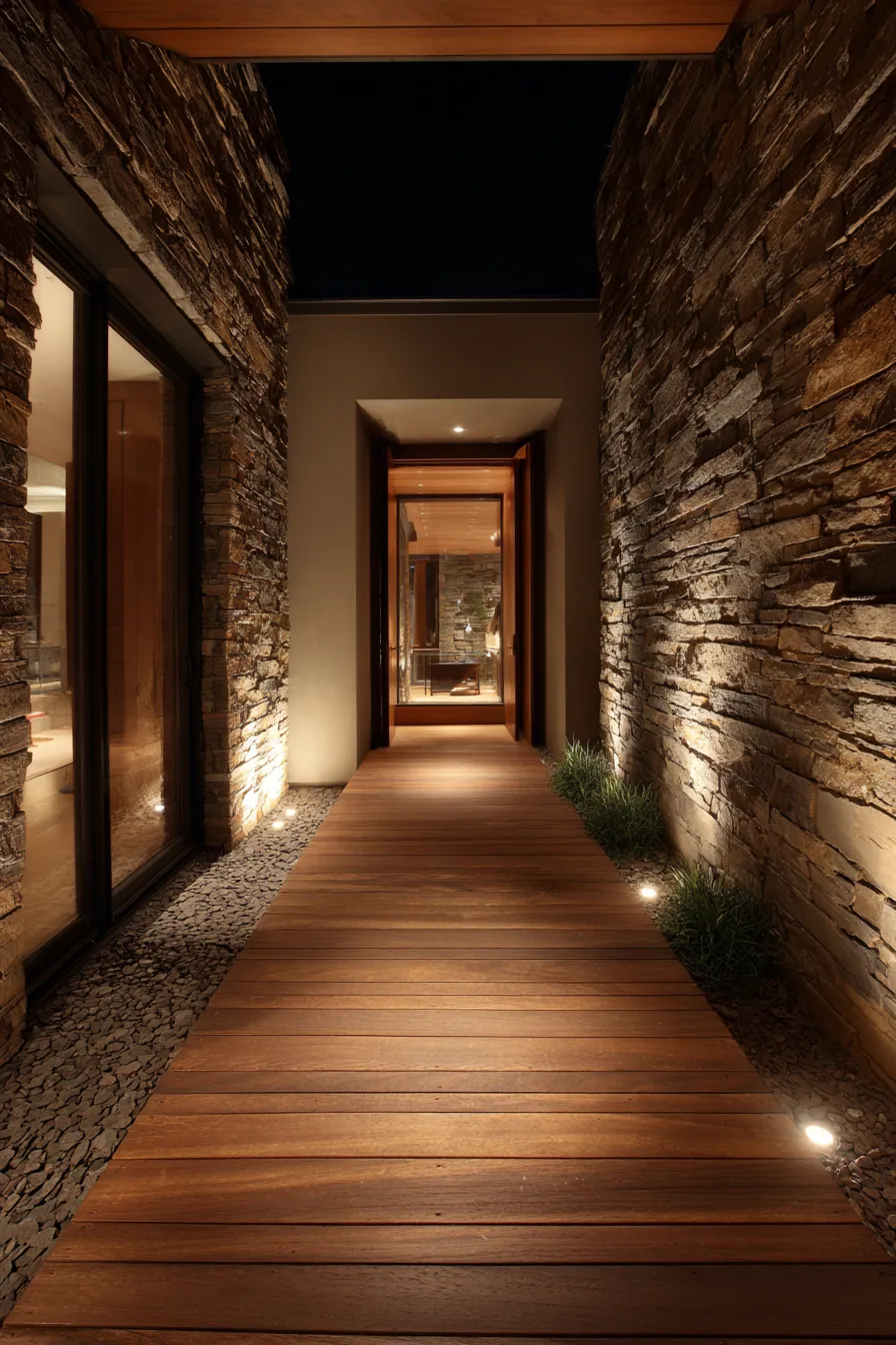 This front porch feels deeply calming with its warm wood walkway, textured stone walls, and subtle ground lighting. The long, narrow layout creates a quiet sense of movement toward the door, while the soft glow highlights each natural surface without overwhelming it. Everything feels balanced, grounded, and intentionally minimal.