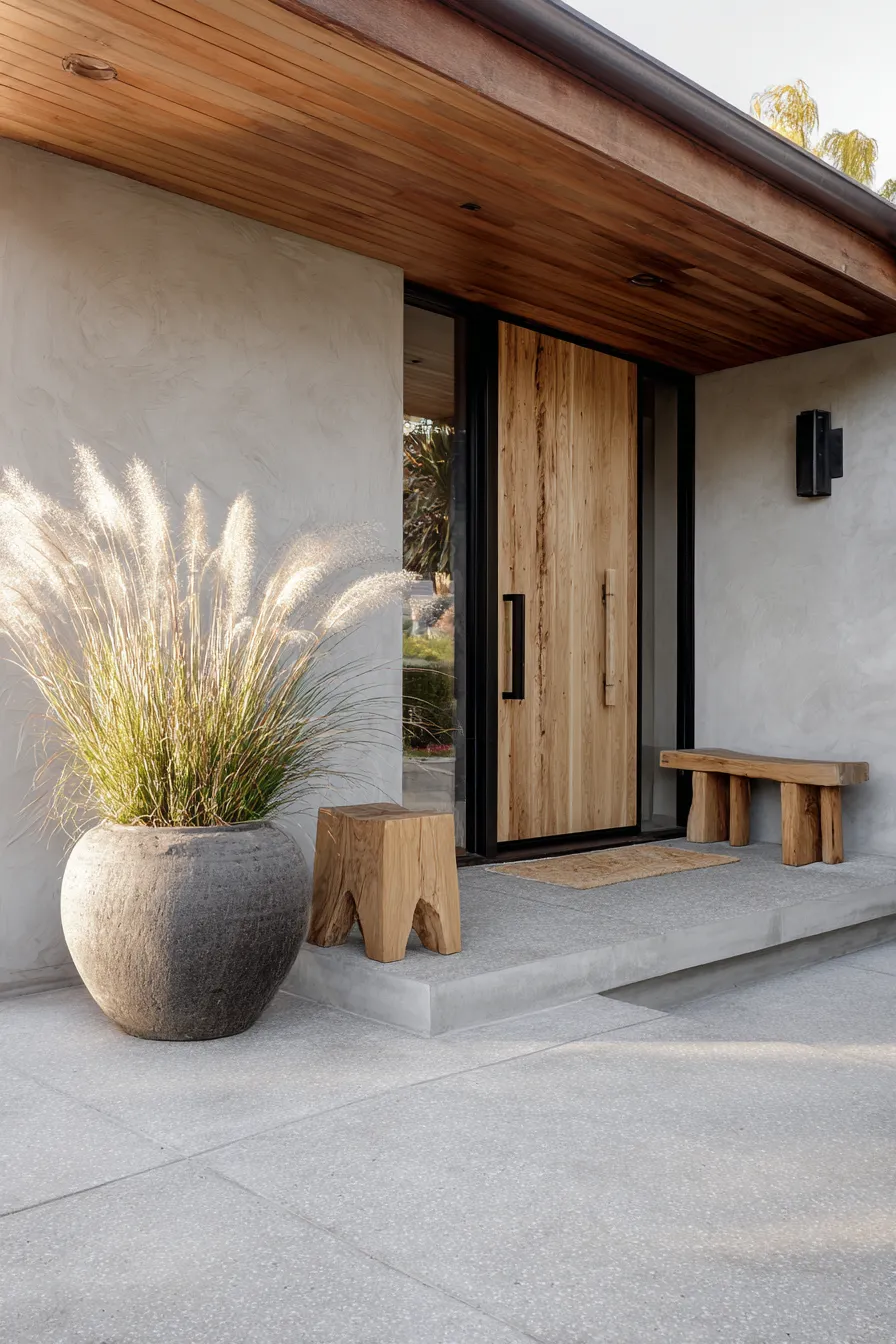 This porch keeps things simple with soft concrete flooring, a warm wood front door, and minimal furniture. A single sculptural planter anchors the space without overpowering it. The clean lines and muted colors keep the focus on texture rather than decor. The look feels modern and peaceful.