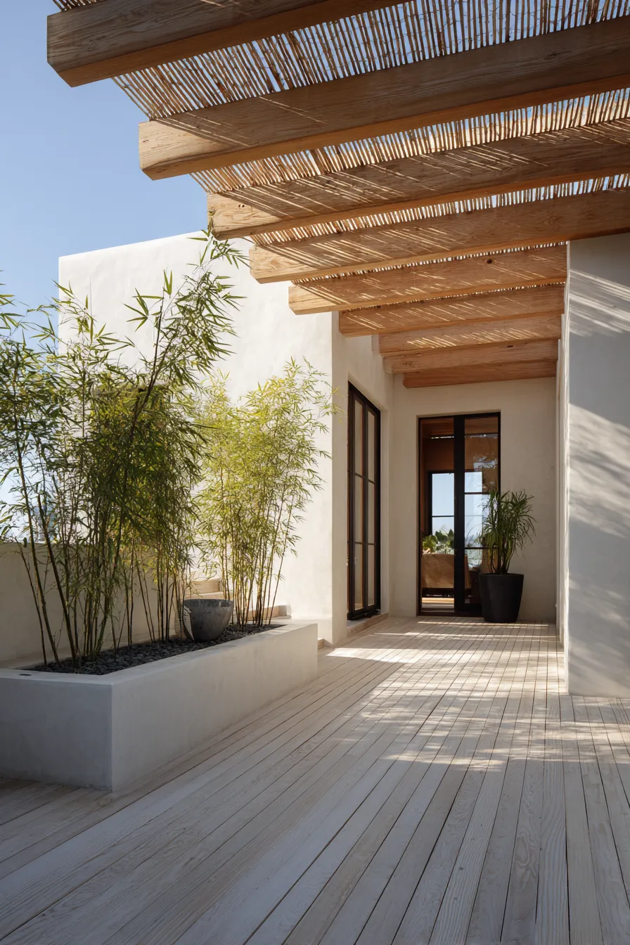 This porch uses pale wood flooring, white walls, and a bamboo planter to create a soft and airy feel. Slatted overhead beams filter light gently across the space. The layout feels open and calming without distractions. Nature is always in view.