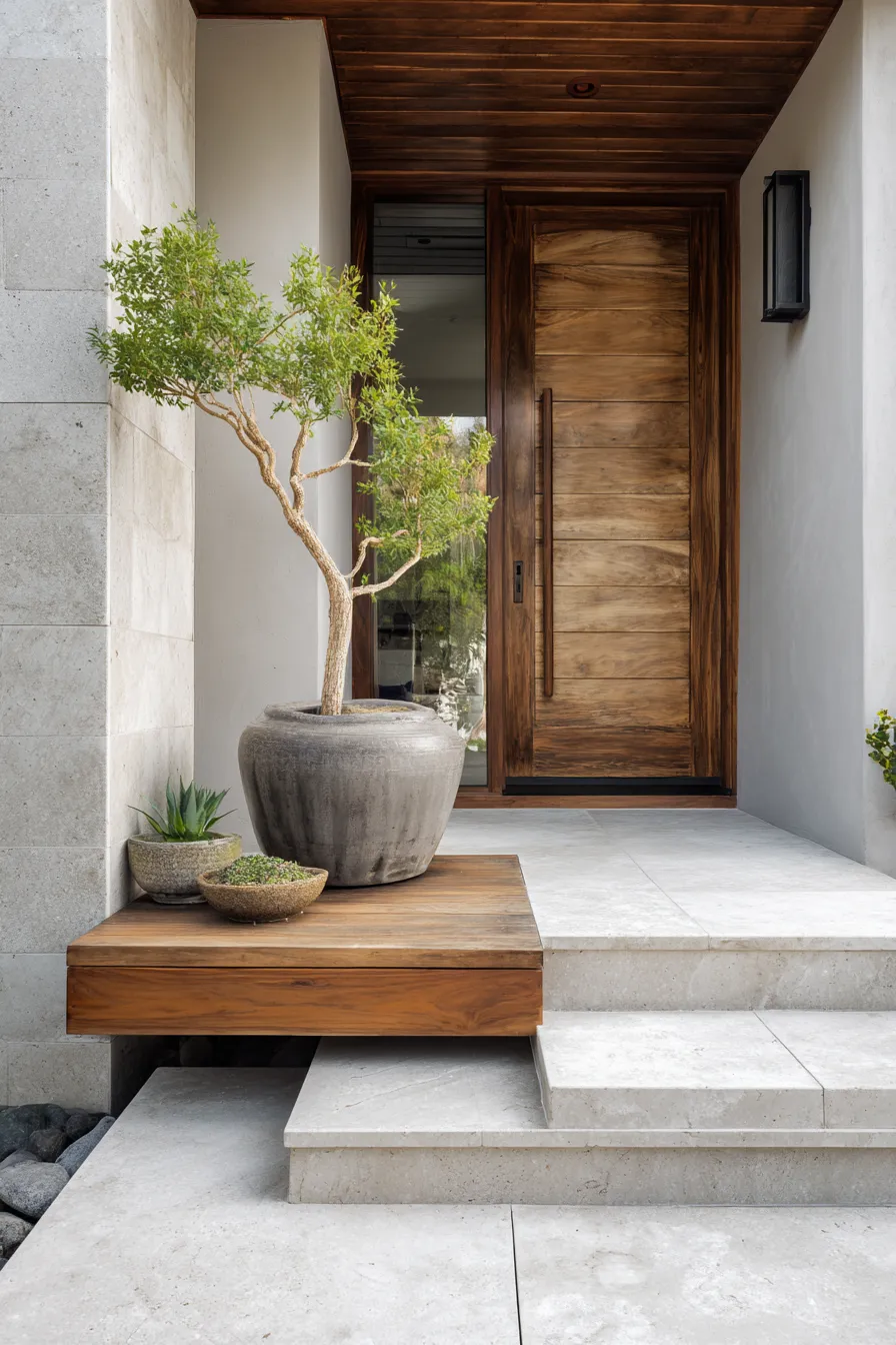 This porch features a raised wooden platform with a large potted tree as the focal point. Clean stone steps and a natural wood door keep the look simple and grounded. The muted color palette enhances the peaceful vibe. Everything feels balanced and calm.
