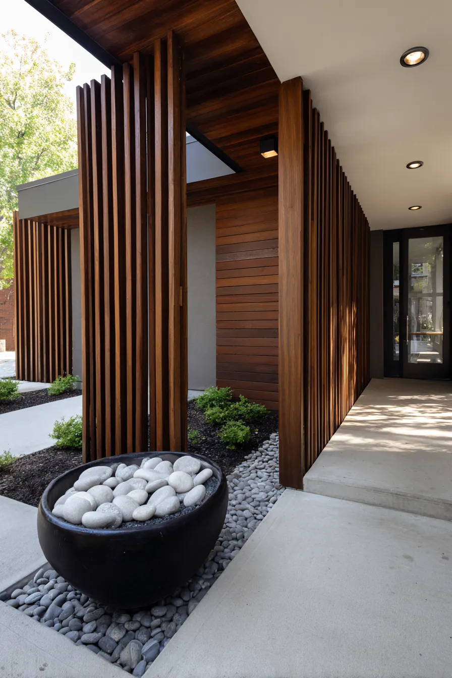 This porch uses vertical wood slats to frame the entry while allowing light to pass through. A stone bowl filled with smooth rocks adds a subtle zen element. Concrete flooring and greenery keep the space grounded. The overall look feels modern and serene.