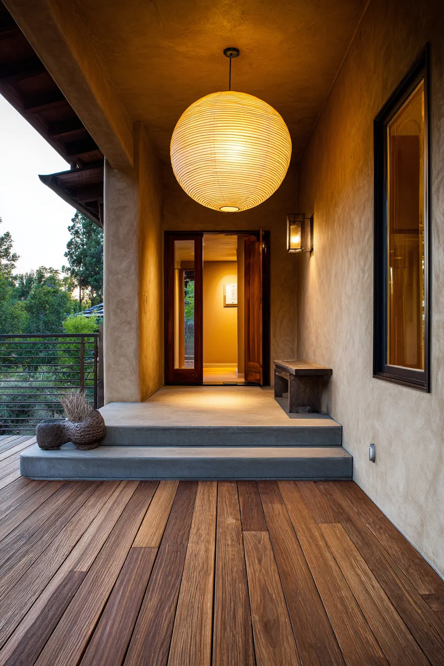 This porch features warm wood flooring, smooth plaster walls, and a glowing round paper lantern overhead. A simple wooden bench and soft lighting set a peaceful mood. The space feels enclosed but never heavy. Everything encourages stillness.