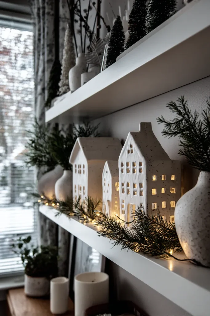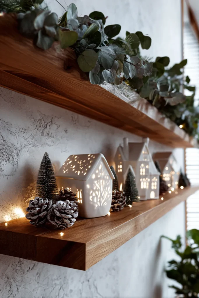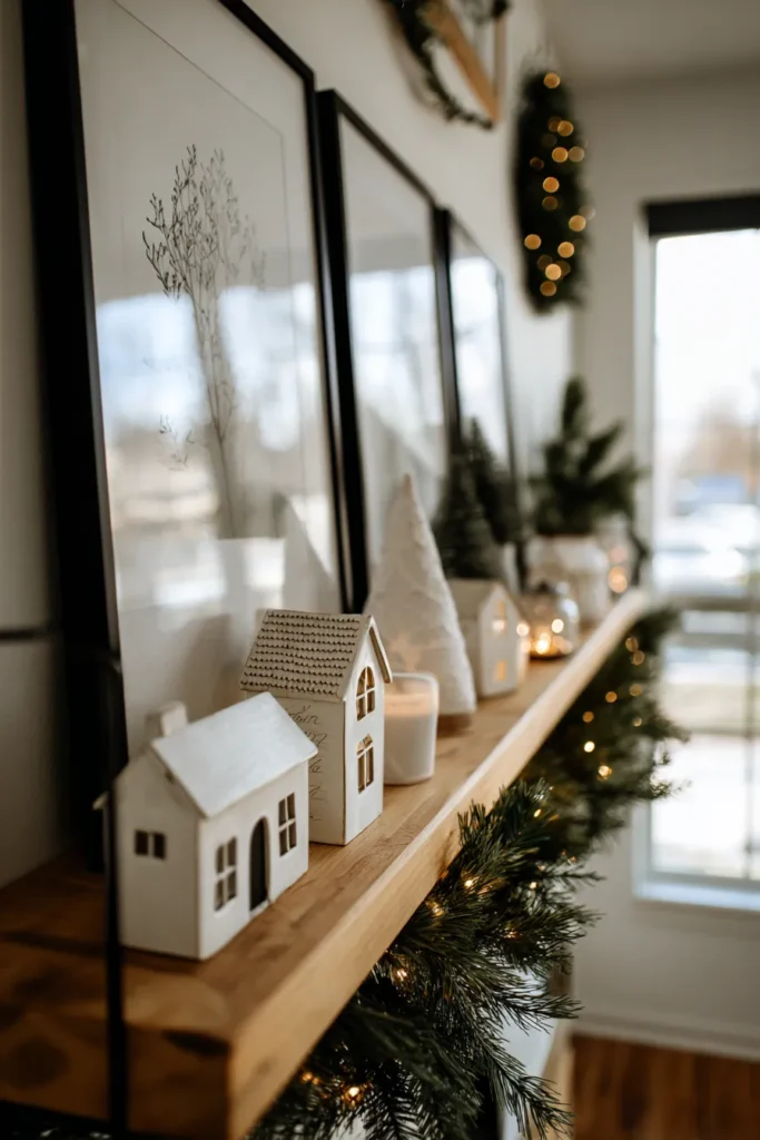 This charming shelf captures that dreamy winter village feeling with its miniature white houses, soft candlelight, and a touch of greenery. The simple wooden shelf feels warm and natural, perfectly complementing the crisp whites and soft shadows from the nearby window. A strand of tiny lights tucked into the greenery below adds just the right hint of sparkle, while framed minimalist art above keeps the whole look clean and balanced.