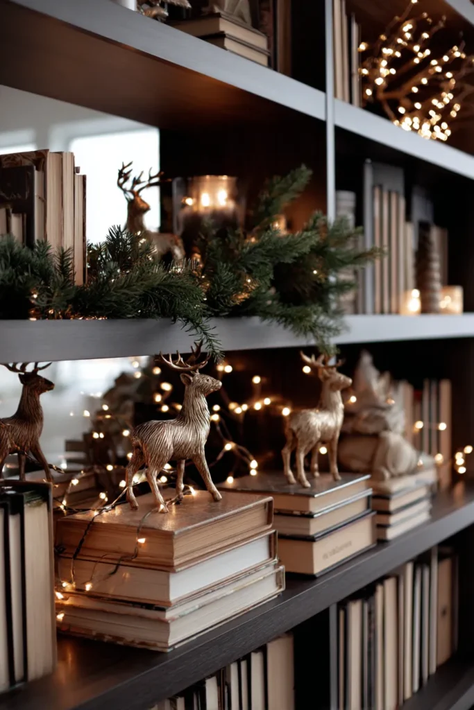 This bookshelf feels like a cozy little library wrapped in holiday cheer. Stacks of vintage books are topped with elegant golden reindeer figurines, while a soft string of fairy lights winds through them, adding a warm, magical glow. A touch of evergreen garland brings freshness to the dark wood tones, and the flicker of candlelight tucked in the background gives everything that moody, fireside feel that just whispers Christmas charm.