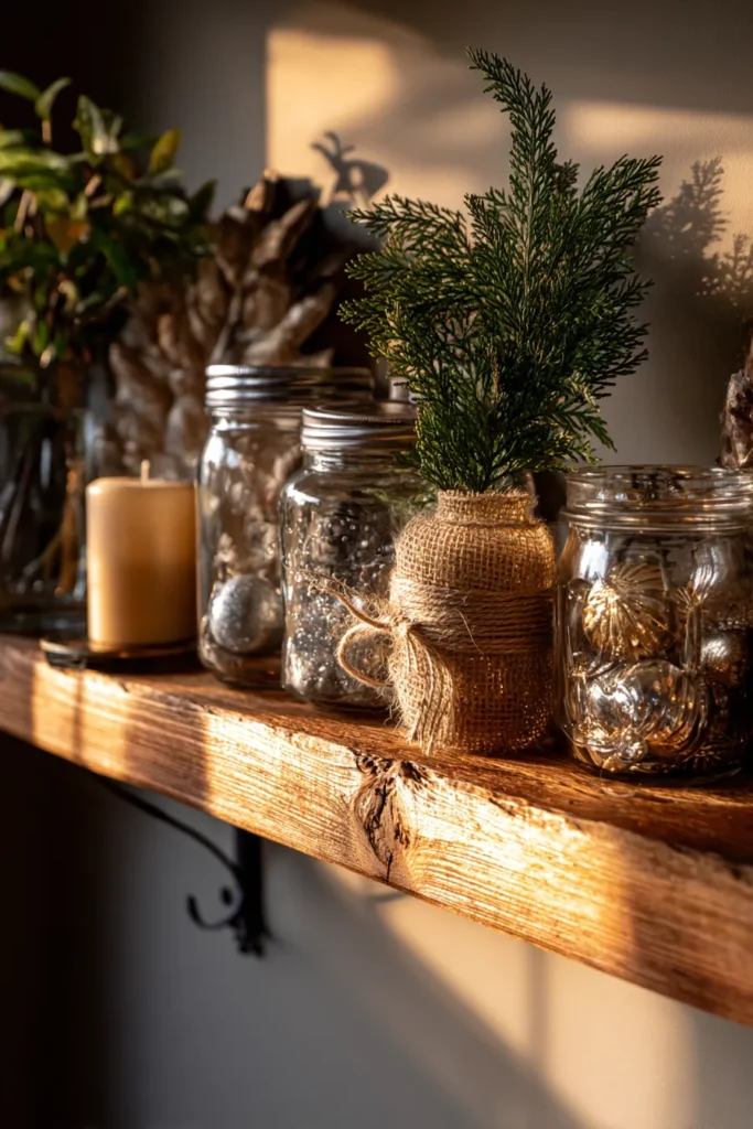 This charming shelf setup brings all the cozy, homespun feels with its warm wood tones and golden sunlight catching every little sparkle. Clear mason jars are filled with silver and gold ornaments, pinecones, and a touch of glitter, creating a simple but stunning mix of rustic and festive. A small evergreen wrapped in burlap adds that touch of nature that softens the shine, while a single candle and leafy greens tie it all together in the most effortlessly elegant way.