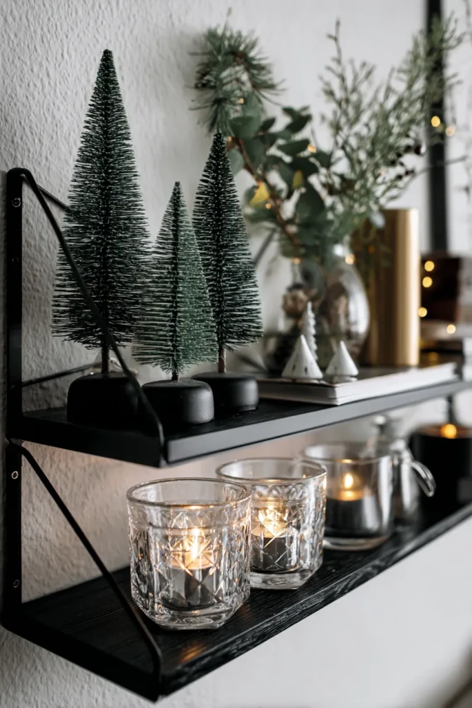 This shelf setup is the perfect example of how simple decor can still make a big statement. A few bottlebrush trees in deep green bring a soft, wintery texture to the sleek black shelving, while crystal candle holders add sparkle and warmth as the flames flicker inside. The touches of greenery and tiny ceramic trees in the background keep the scene fresh and natural without feeling cluttered. It’s minimalist, modern, and full of cozy charm.
