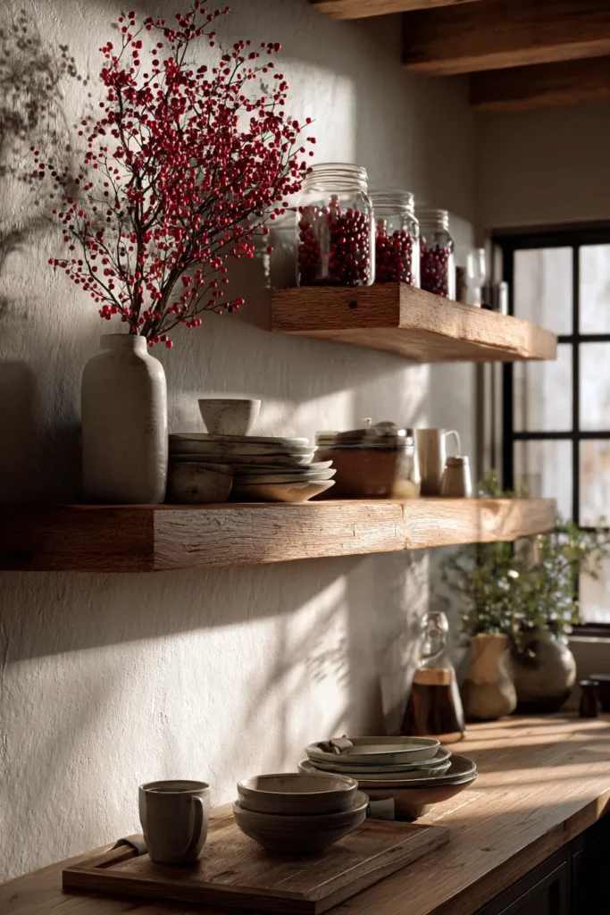 I’m obsessed with how fresh and natural this look feels. The red berries add just the right amount of holiday color without taking over the space, and the simplicity of the ceramics keeps it calm and grounded. It’s the kind of setup that makes me want to start styling my own kitchen shelves with a few cozy seasonal touches, especially when the light hits just right in the morning.