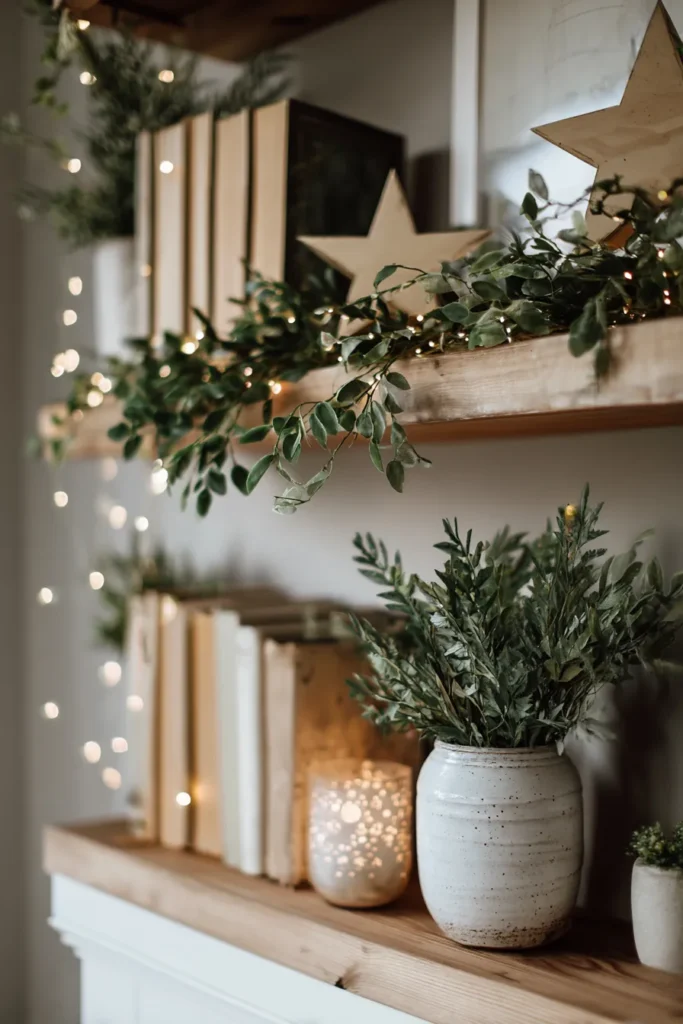 This shelf decor feels like the perfect mix of earthy and festive. Layers of soft greenery spill gently over the wooden edges, paired with warm fairy lights that create the dreamiest glow. Simple touches like ceramic vases, stacked books, and a few rustic stars keep the look charming without feeling cluttered. The mix of natural textures with the twinkling light makes everything feel relaxed and inviting, like a cozy nook ready for holiday evenings.