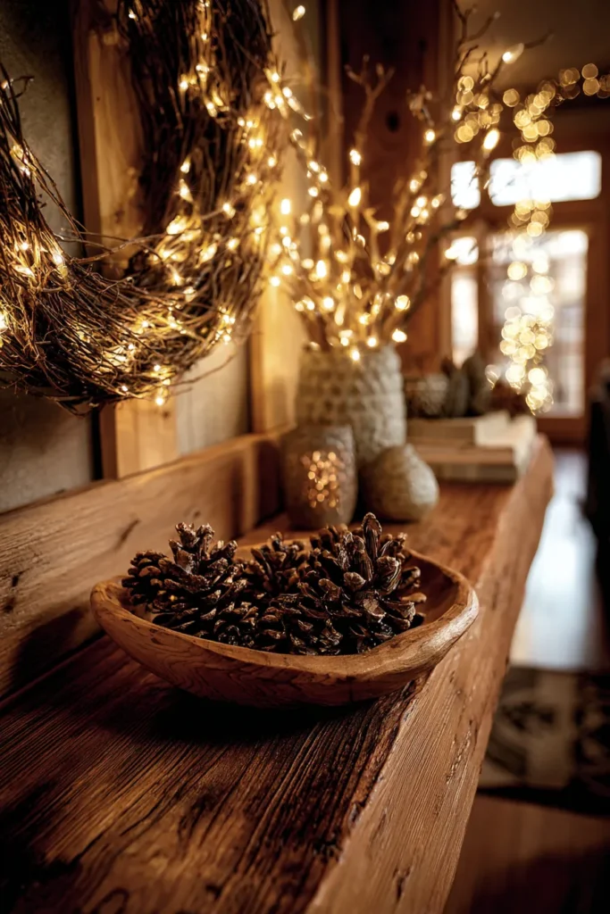 This design is the ultimate mix of cabin coziness and festive sparkle. A weathered wooden shelf holds a carved bowl of pinecones, while warm fairy lights weave through wreaths and branches, creating a soft golden glow. The whole setup feels perfectly imperfect with its natural textures, from the rough wood grain to the twigs that shimmer in the light. It’s rustic, inviting, and beautifully moody, like something straight out of a mountain lodge at Christmastime.