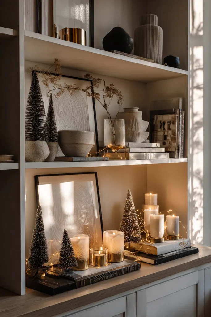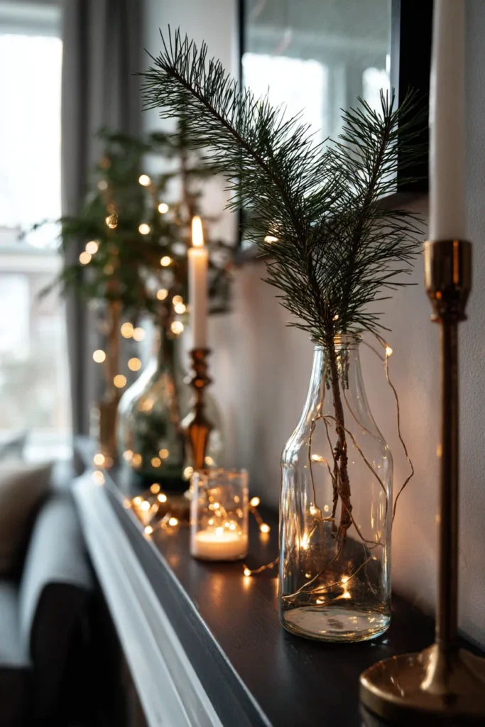 This shelf decor feels effortlessly chic with its mix of glass, greenery, and soft candlelight. Clear bottles hold simple pine branches that stretch upward, while tiny fairy lights add a warm shimmer that dances off the glass. Brass candlesticks and votives bring just the right amount of glam, balancing the natural touches with a little holiday sparkle. It’s modern, minimal, and quietly festive all at once.