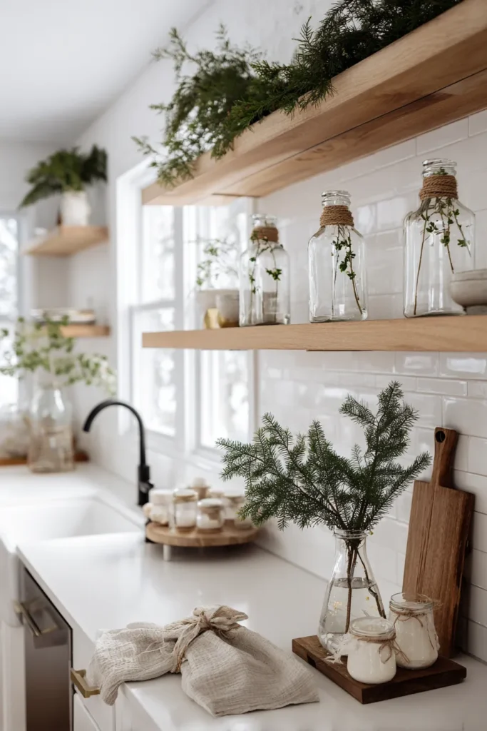 Minimal Kitchen Shelves with Fresh Evergreen Accents