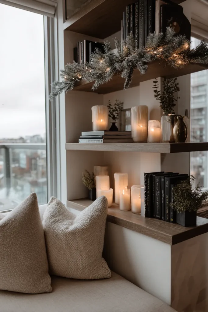 Soft Candlelight and Frosted Greenery in a Cozy Reading Nook