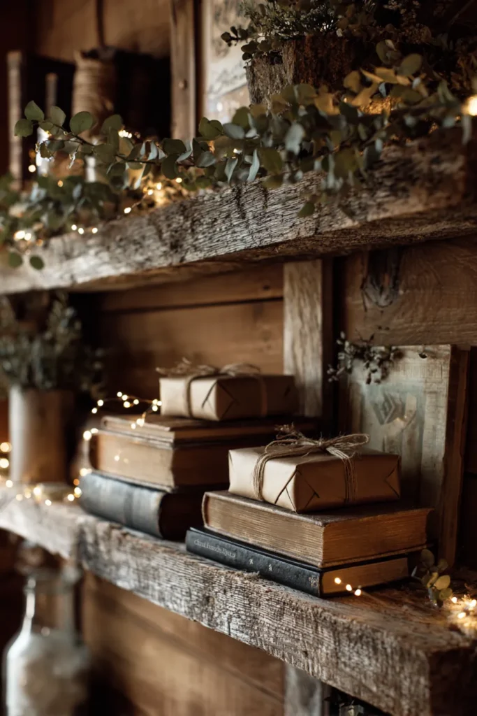 This shelf feels like it belongs in a cozy cabin straight out of a Christmas storybook. The weathered wood, the soft twinkle of fairy lights, and the eucalyptus garland all work together to create the warmest atmosphere. Stacks of old books topped with simply wrapped gifts add a nostalgic charm, while the mix of rough textures and soft lights keeps it from feeling too polished. It’s rustic, timeless, and perfectly imperfect in the best way.