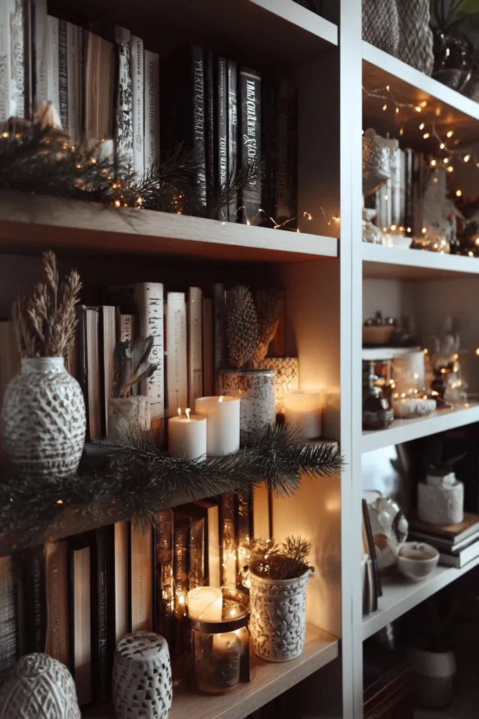 This bookshelf feels like pure winter magic. Soft pine garlands wind through the shelves, their fairy lights casting a golden glow over stacks of well-loved books. Ceramic vases and frosted candleholders add a lovely texture, mixing rustic and refined in just the right way. The candles bring warmth to the muted color palette, turning the whole setup into a cozy little Christmas nook that feels timeless and calm.