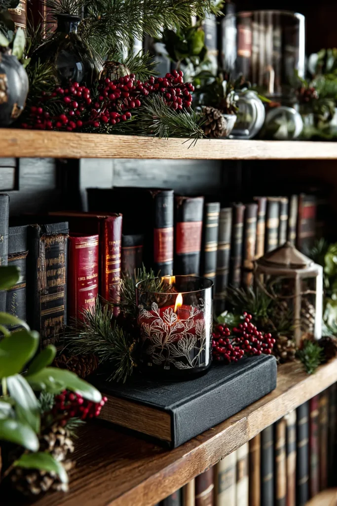 I absolutely love how this design feels like old-world charm meets festive magic. The combination of worn book spines, glossy berries, and candlelight is just beautiful. It’s one of those setups that makes you want to sit back with a cup of cocoa and get lost in a good story. It feels luxurious without trying too hard, and honestly, that’s my favorite kind of Christmas style.