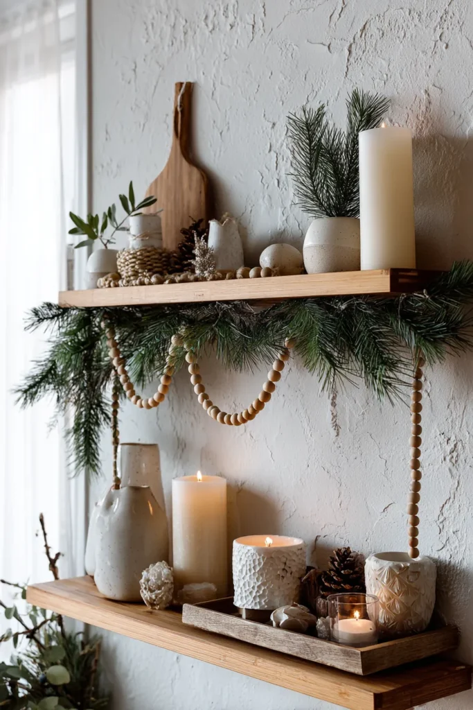 This shelf design feels like a breath of fresh winter air. Simple pine branches are draped with wooden bead garlands that add a lovely rustic rhythm, while creamy candles and ceramic vases create a soft, cozy glow. The mix of textures from wood, pottery, and greenery gives it a handcrafted charm, and the earthy palette keeps the look natural and timeless. It’s perfectly imperfect in the most beautiful way.