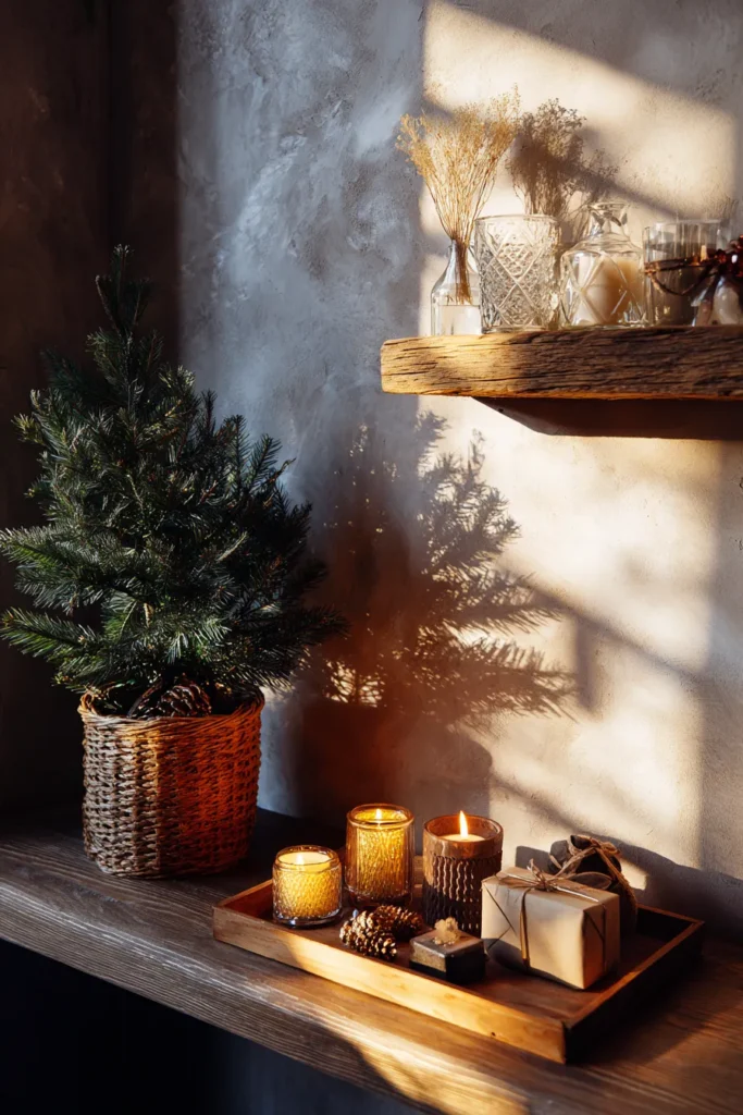 This design feels like golden-hour Christmas coziness captured in one little corner. A small evergreen tree in a woven basket adds the perfect natural touch, while a wooden tray holds flickering candles, pinecones, and a neatly wrapped gift. The sunlight hits just right, casting soft shadows across the textured wall and bringing the whole setup to life. Everything about it feels warm, peaceful, and effortlessly festive.
