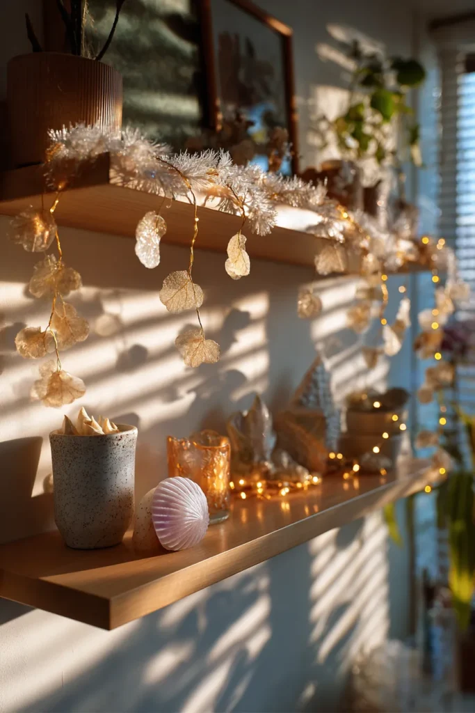 This shelf setup feels like a soft Christmas daydream. Warm sunlight spills across the room, catching the shimmer of delicate gold fairy lights and a garland made of frosted leaves. Natural textures like wood, pottery, and seashell accents bring a cozy yet airy feel, while subtle metallic hints add a festive glow. It’s light, breezy, and beautifully balanced between minimal and magical.