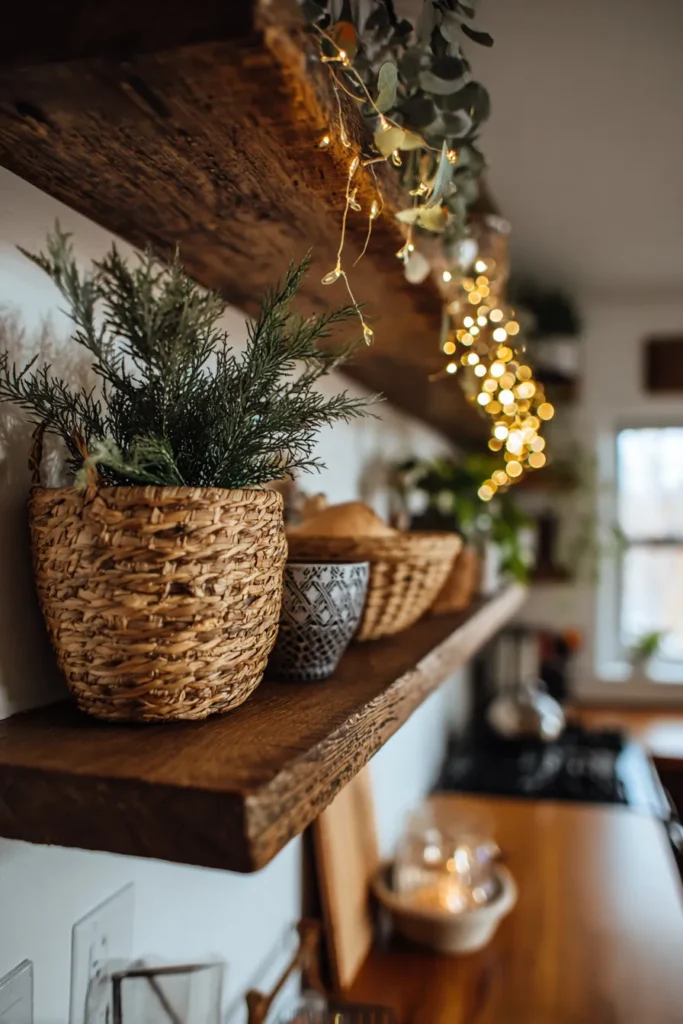 Rustic Kitchen Shelves with Cozy Holiday Twinkle