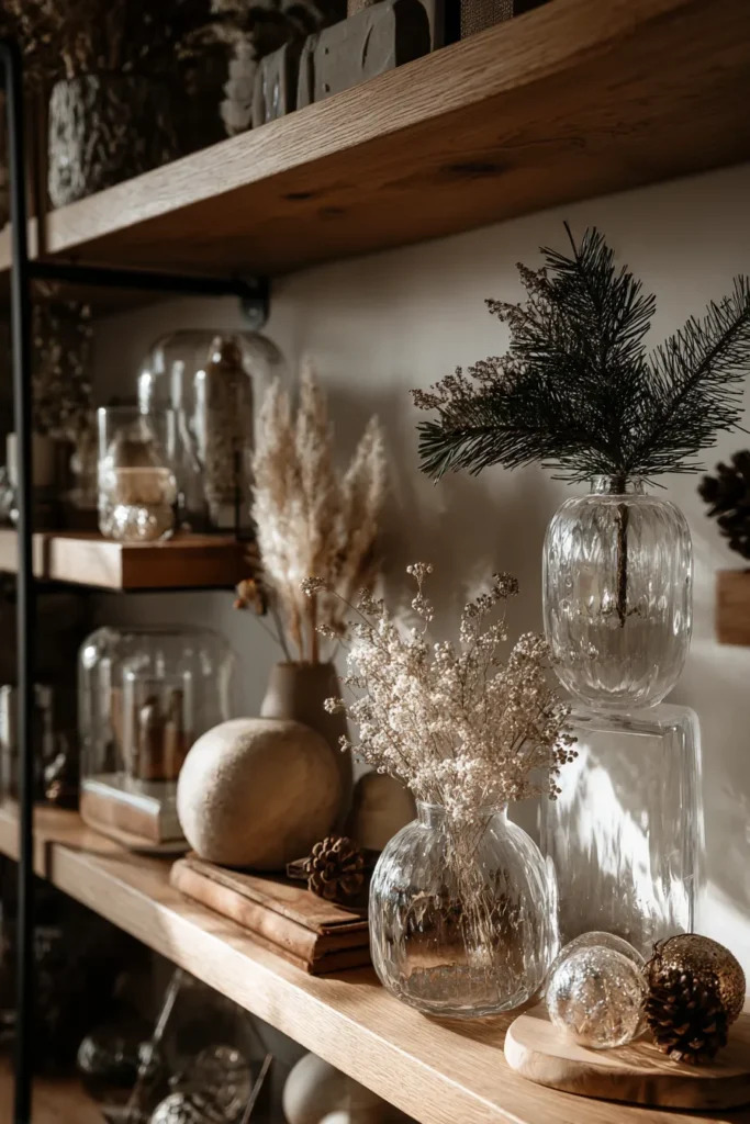 This design celebrates a softer, more organic side of Christmas decorating. Wooden shelves hold glass vases filled with pine sprigs, dried florals, and pampas grass, creating a beautiful blend of texture and tone. A few golden ornaments and pinecones are sprinkled in just enough to whisper “holiday” without shouting it. The overall feel is warm and earthy, perfect for anyone who loves a cozy neutral look that still feels festive.