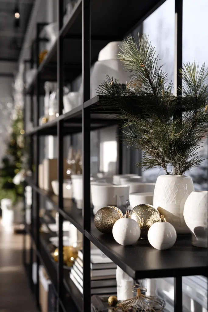 This sleek black shelving unit is the perfect example of how modern design can still feel festive and warm. Clean lines and open shelves create space for white ceramics, neutral-toned books, and a few shimmering ornaments that bring subtle sparkle to the room. A sprig of evergreen in a simple vase adds just enough greenery to keep things fresh and seasonal. The contrast between the dark frame and the soft whites and golds feels balanced and effortlessly chic.