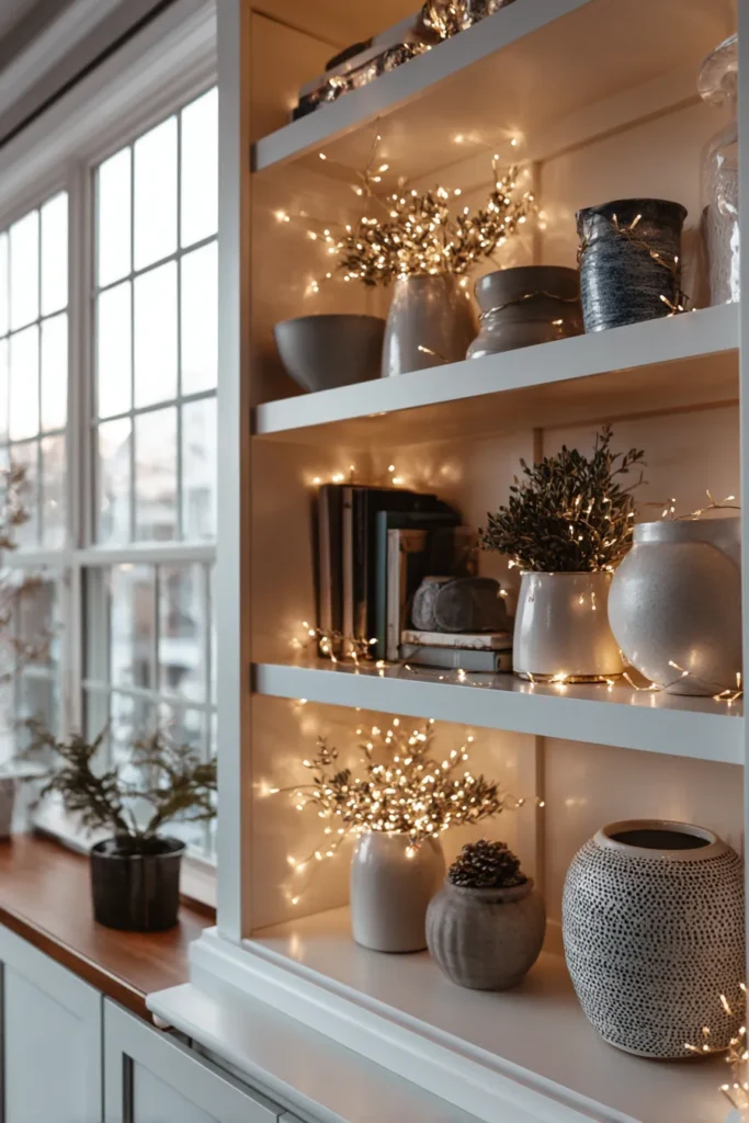 This built-in shelf setup shows how a little sparkle can completely transform a space. Neutral pottery, soft-toned books, and a few sprigs of greenery create a cozy foundation, while the string lights woven throughout bring everything to life. The warm glow reflects beautifully off the ceramics and gives the whole corner that quiet, twinkling charm that makes winter evenings feel special. It’s proof that simple styling can still look so magical.